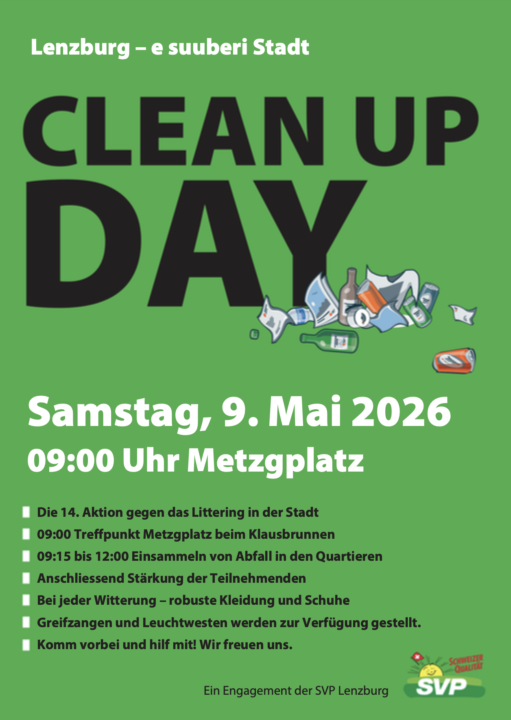 Liegengelassener oder achtlos weggeworfener Abfall auf öffentlichem Grund ist ein allgemeines Ärgernis. Wir setzen mit der 14. Littering-Aktion dagegen. Besammlung 9:00 Uhr beim Klausbrunnen auf dem Metzgplatz. 09:15-12:00 Uhr Einsammeln von Abfall in den Quartieren. Anschliessend Stärkung der Teilnehmenden. Der Anlass findet bei jeder Witterung statt. Robuste Kleidung und Schuhe empfehlen sich. Greifzangen und Leuchtwesten werden zur Verfügung gestellt. Wir freuen uns auf zahlreiche Teilname beim Einsatz für «e suuberi Stadt».