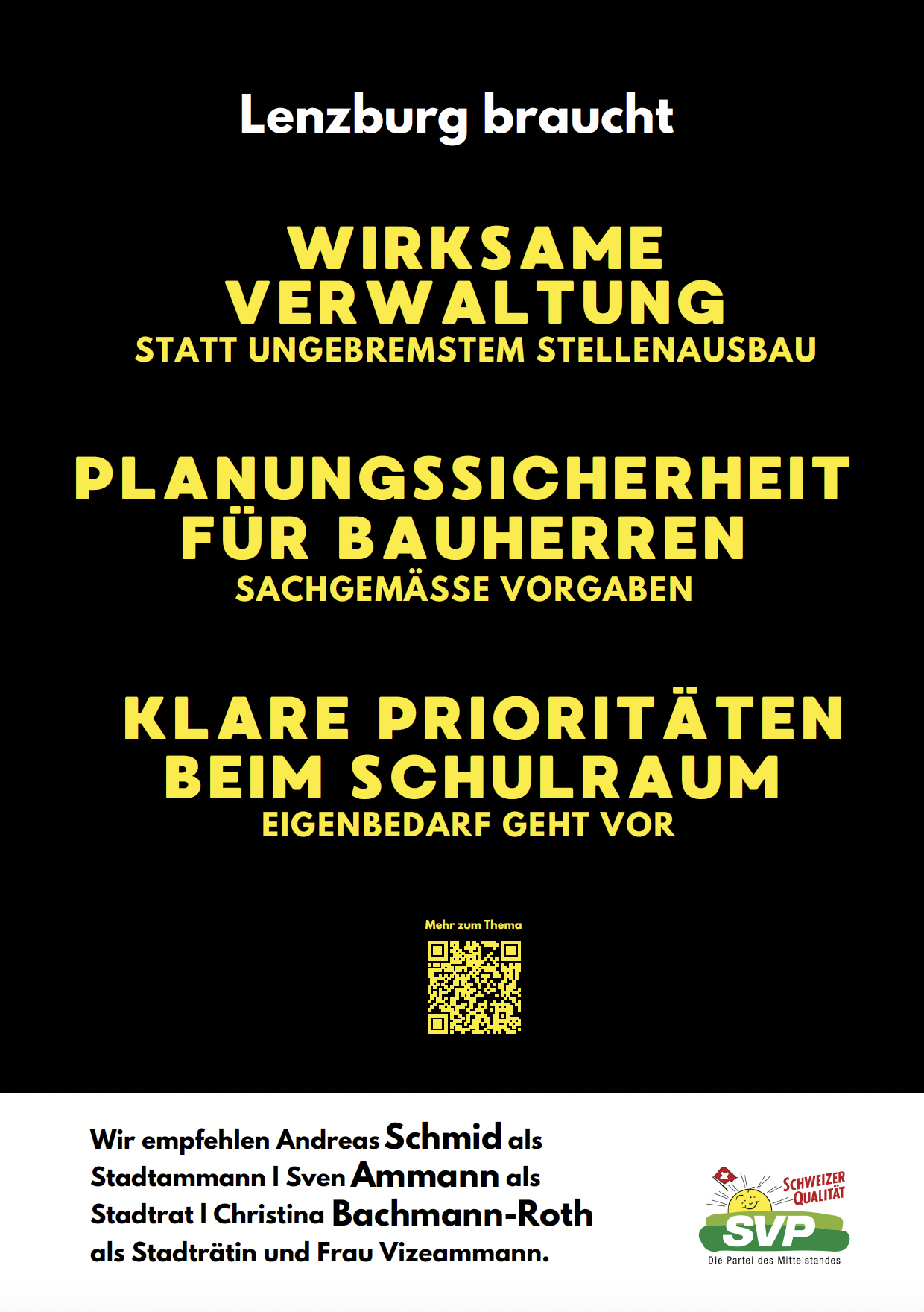 Die SVP Lenzburg tritt an den diesjährigen Stadtratswahlen nicht mit einer eigenen Kandidatur an, benennt aber die dringlichen Themen für die kommende Legislatur. Bei den nachfolgenden Aspekten sieht sie den Handlungsbedarf für die zukünftige Stadtregierung. Ebenso wird sie sich mit ihren Einwohnerrätinnen und -räten sowie ihren Vertreterinnen und Vertretern in den städtischen Kommissionen dafür stark machen.